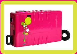 Back in the winter of 2003, we met a Brooklyn gentleman who goes by the name of “Dalek.” As part of a gallery project entitled “Dream So Much,” we lent him a white Colorsplash camera to customize as he pleased. Two weeks later, we were awestruck to see the results! Our plain camera had been transformed into a jazzy black and white number that used dozens of black typeset stickers to create a half-camo, half jumbled letters pattern – with one crazy, staring eye smack in the middle of it.